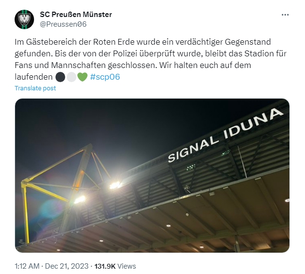 球场出现不明爆炸物:明斯特VS多特2队德丙比赛被迫推迟